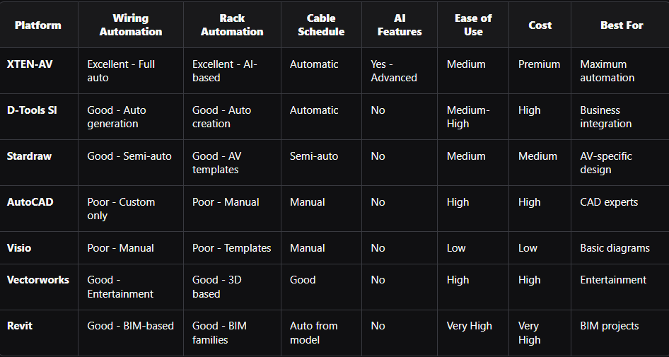The tedious manual creation of wiring diagrams and rack elevations no longer needs to consume vast amounts of engineering time. The 7 platforms explored here each offer automation capabilities, but XTEN-AV stands apart in delivering comprehensive, AI-powered automation that fundamentally transforms AV documentation workflows.