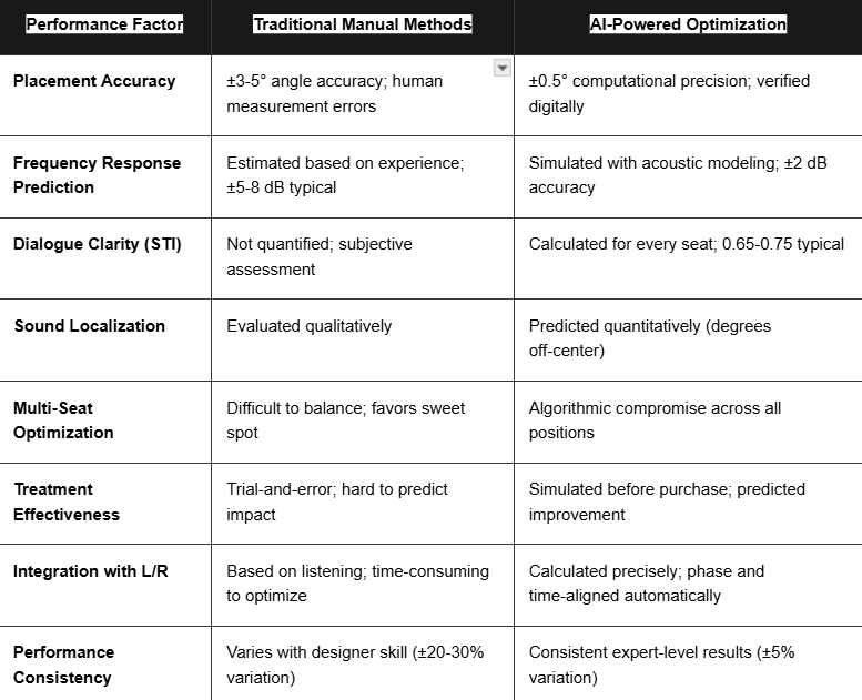 Traditional center channel speaker placement relies on human expertise applying acoustic principles through manual calculations, measurements, and iterative adjustments. While experienced integrators develop intuition over time, this approach has inherent limitations:
