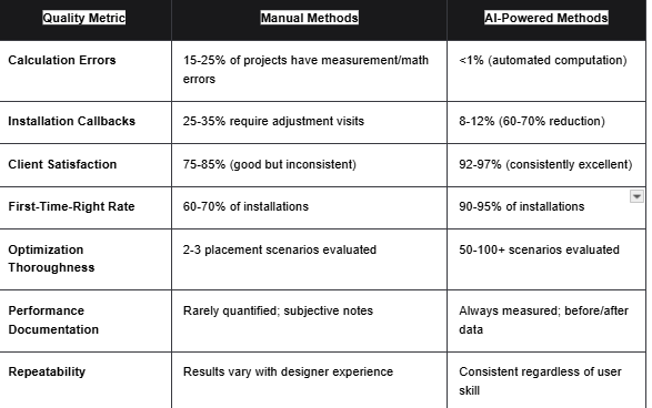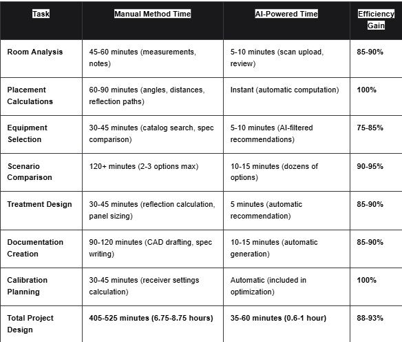 AI-powered placement reduces design time by 88-93%—from 6.75-8.75 hours using manual methods to 35-60 minutes with AI automation. Specific time savings: Room analysis drops from 45-60 minutes to 5-10 minutes (85-90% faster), placement calculations from 60-90 minutes to instant (100% faster), documentation creation from 90-120 minutes to 10-15 minutes (85-90% faster). Over a year handling 30-50 installations, an integrator saves 180-420 hours of design labor—equivalent to $18,000-63,000 at $100-150/hour rates. Additional time savings occur in reduced callbacks (60-70% fewer) and faster client approvals (data-driven presentations close deals quicker). Most firms recover software investment within 3-5 projects then realize pure profit improvement.